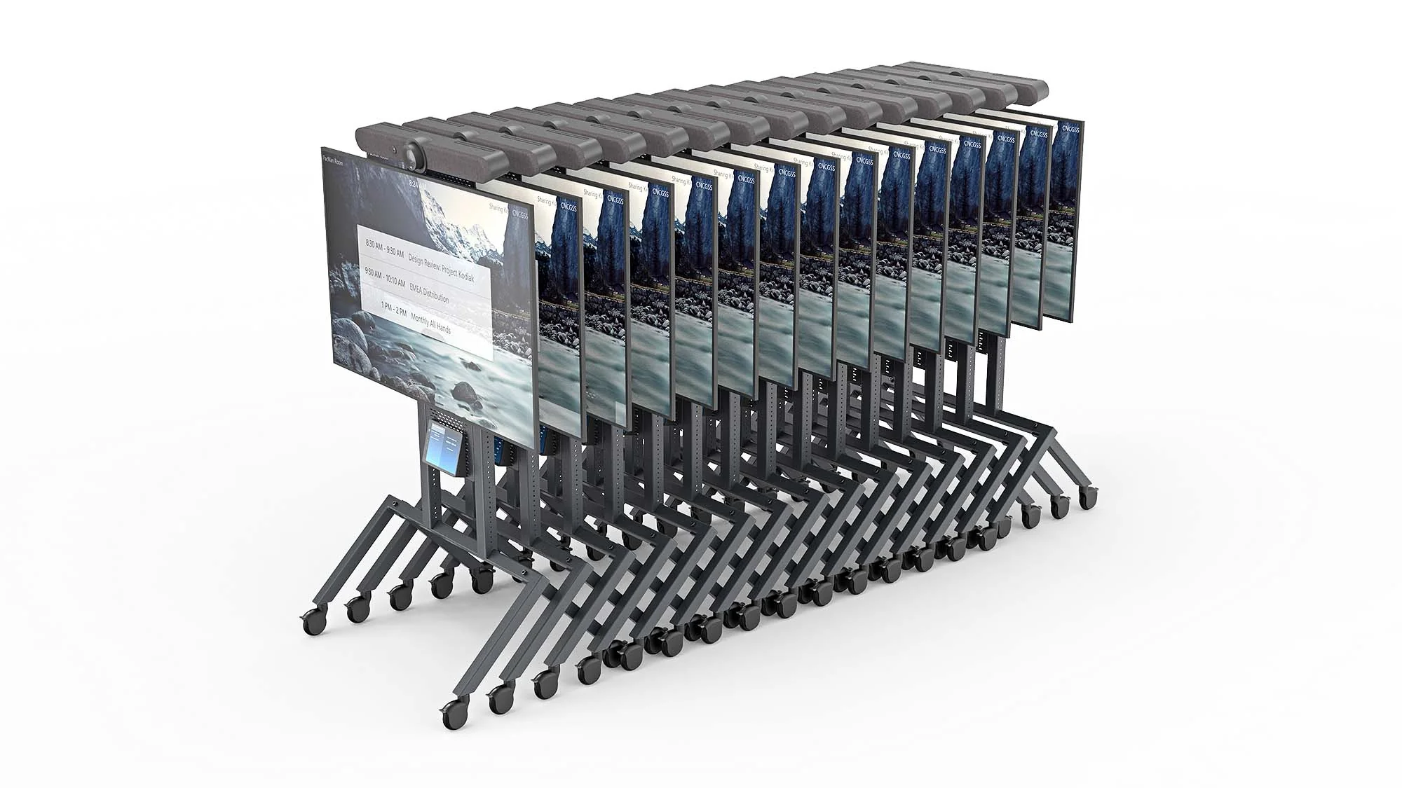 Unser patentiertes Nesting-Design ist ideal für Masseneinsätze, bei denen Ressourcen geteilt werden und der Platz begrenzt ist. Lagern Sie eine Flotte von Meeting-Wagen sicher und rollen Sie sie genau dorthin, wo sie am dringendsten benötigt werden.