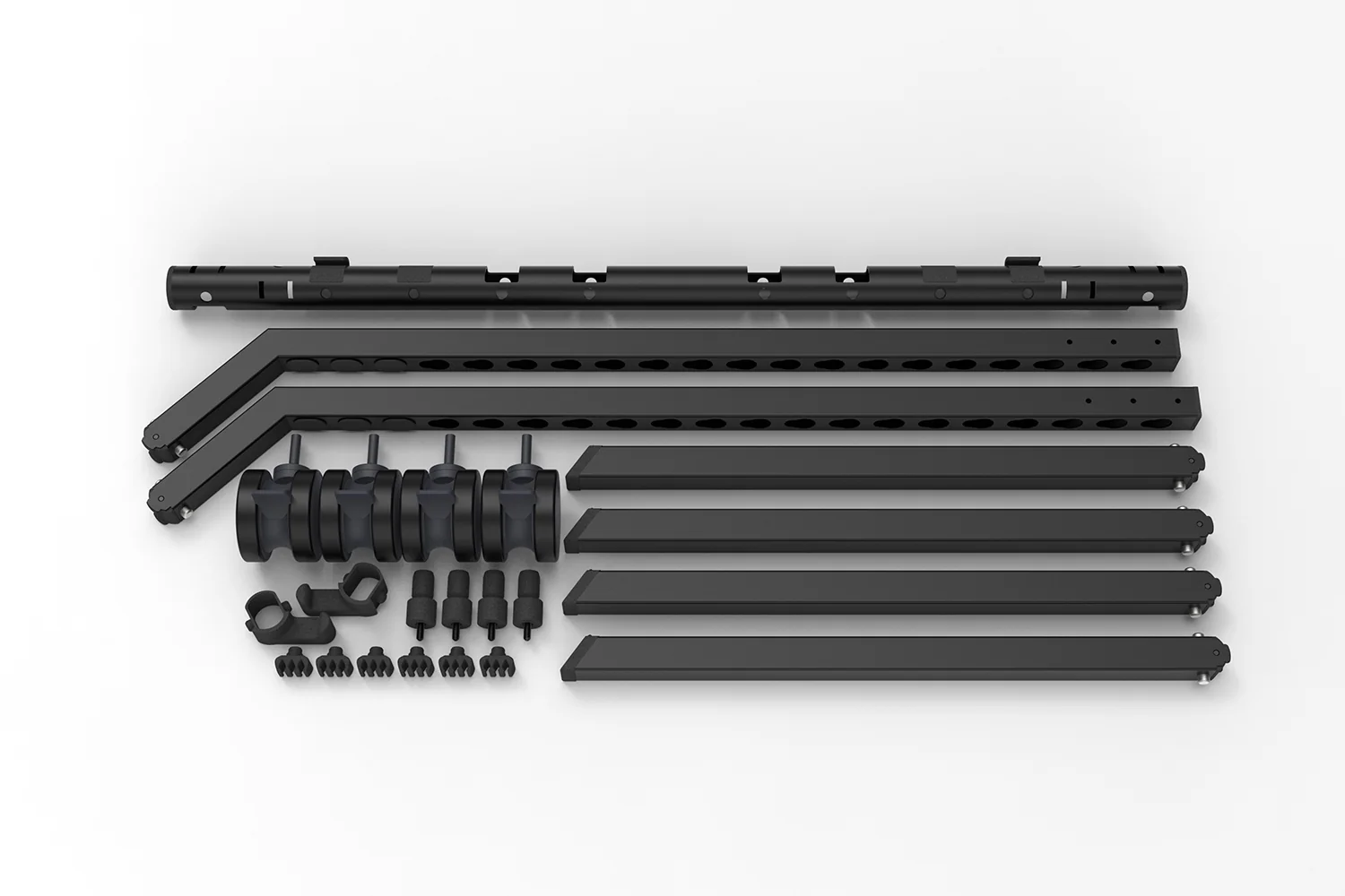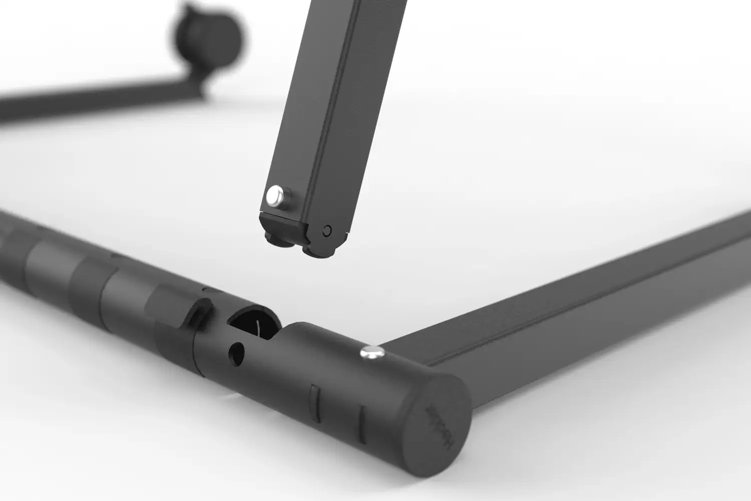 Mit unserem zum Patent angemeldeten Heckler Connection System können Sie den Ständer schnell und werkzeuglos auf- oder abbauen, was eine angenehme Einrichtung und Verpackung ermöglicht. Die resultierende Konstruktion ist eine äußerst stabile Verbindung aus sich kreuzenden Stahlrohren.